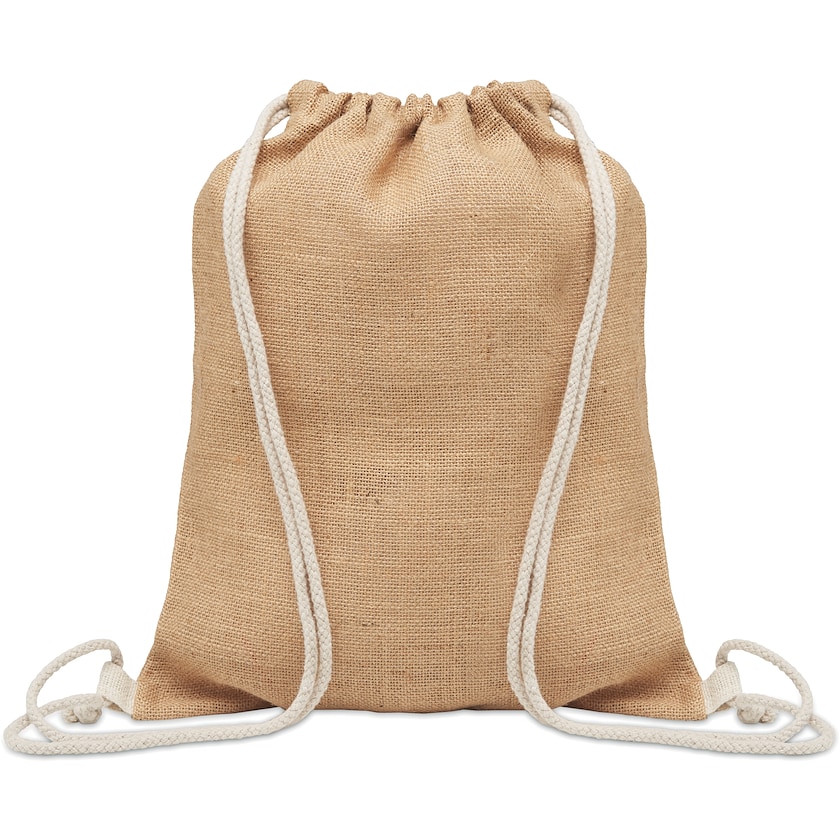 Schöner Turnbeutel aus Jute. Wählen Sie zwischen weißen oder schwarzen Baumwollschnüren.