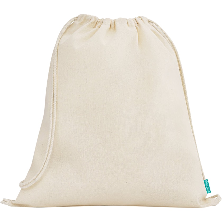 Turnbeutel aus 100% Bio-Baumwolle. Seitlich befindet sich ein Etikett mit dem Hinweis "organic". Der Baumwollstoff wird komplett ohne Verwendung von Insektenbekämpfungsmitteln gewonnen.