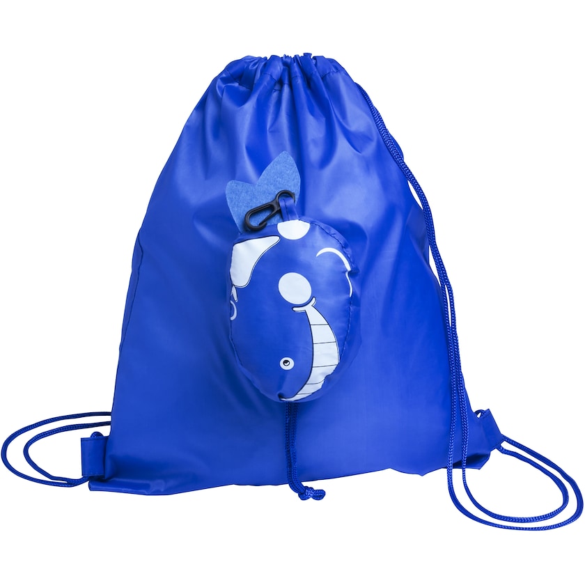 Zoe bekommt beim Zusammenziehen die Form eines Tieres. Der Sportbeutel ist mit einem Karabinerhaken aus Plastik versehen. So kann er beispielsweise am Rucksack befestigt werden.