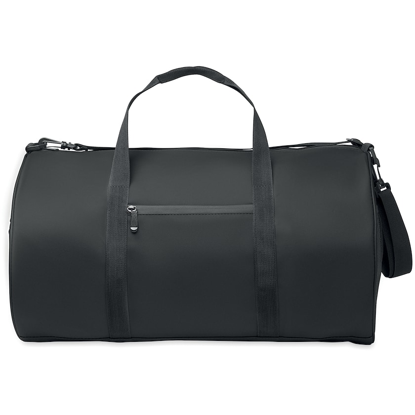 Reisetasche aus recyceltem Material. Die Tasche verfügt über mehrere Reißverschlusstaschen: eine auf der Vorderseite, eine an der kurzen Seite und eine im Inneren.