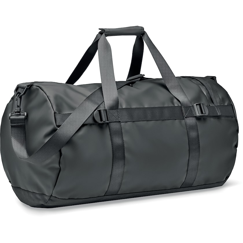 Trainingstasche aus wasserdichtem Planenstoff. Der Stoff ist nicht nur wasserdicht, sondern auch sehr langlebig. Im Inneren befindet sich eine kleinere Tasche mit Reißverschluss.