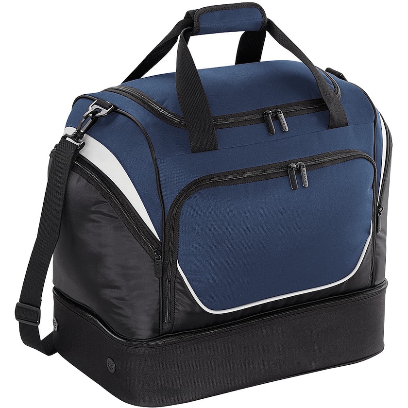 Kompakte Sporttasche, ihr Design macht sie passend für fast jeden Umkleideschrank. Die Tasche hat ein separates Fach mit Ventilation, passend für beispielsweise Trainingsschuhe oder Handtuch. Innen gibt es ein Fach für Wertsachen und verschiedene Netzfächer. Der Schultergurt ist verstellbar, die unter der Tasche befindlichen Füße verhindern das Rutschen der Tasche.