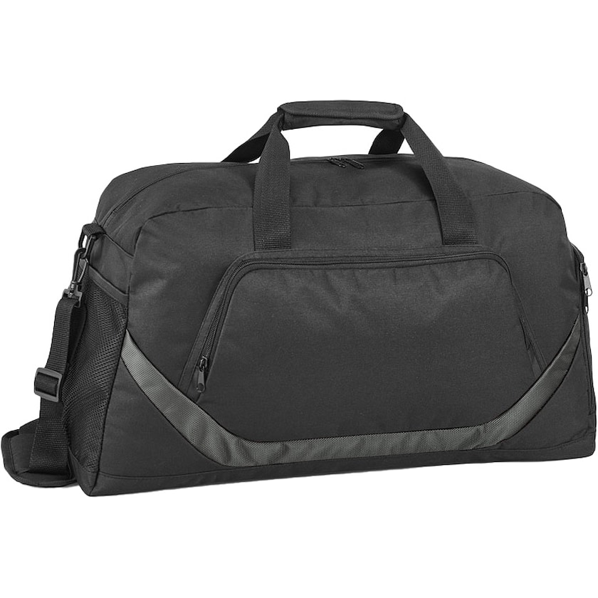 Geräumige Trainingstasche bedrucken. West Hills hat eine gefütterte Innenseite und einen harten Boden. Auf der Vorderseite befindet sich eine Reißverschlusstasche. An den kurzen Seiten befindet sich eine Netztasche und eine weitere Reißverschlusstasche. Der Schultergurt ist gepolstert und verstellbar.
