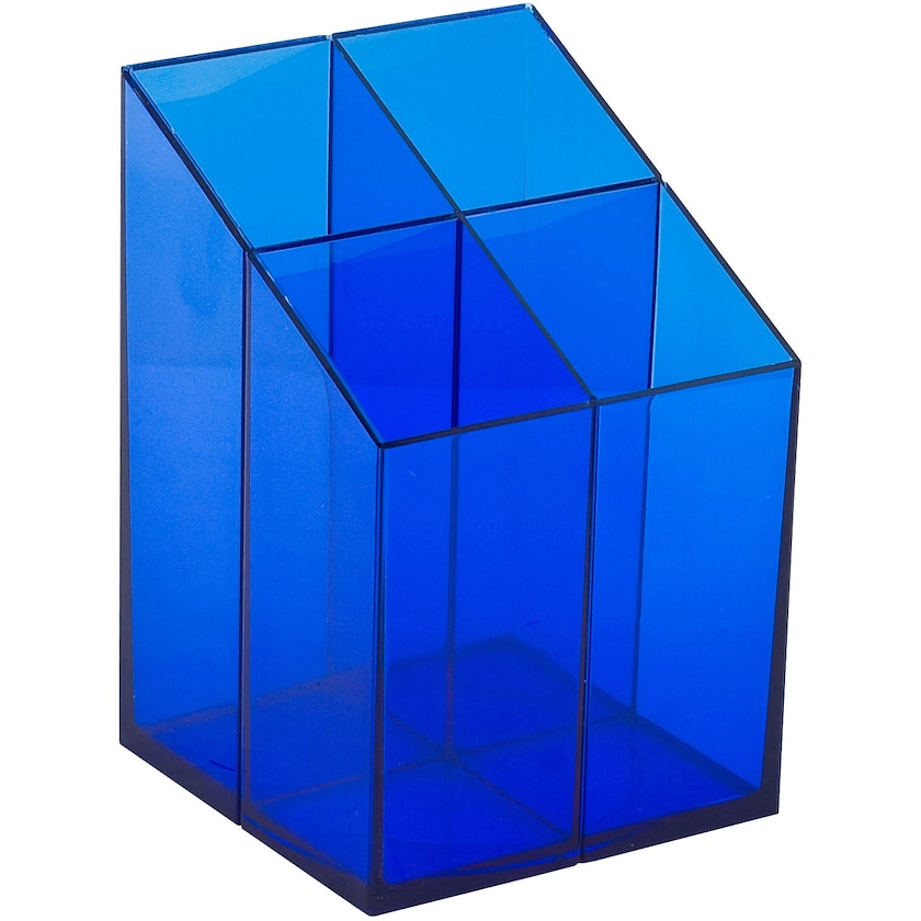 Stifthalter aus translarentem Kunststoff. Regal hat vier Fächer. Dank der abgeschrägte Form kann man auch kürzere Stifte darin aufbewahren.