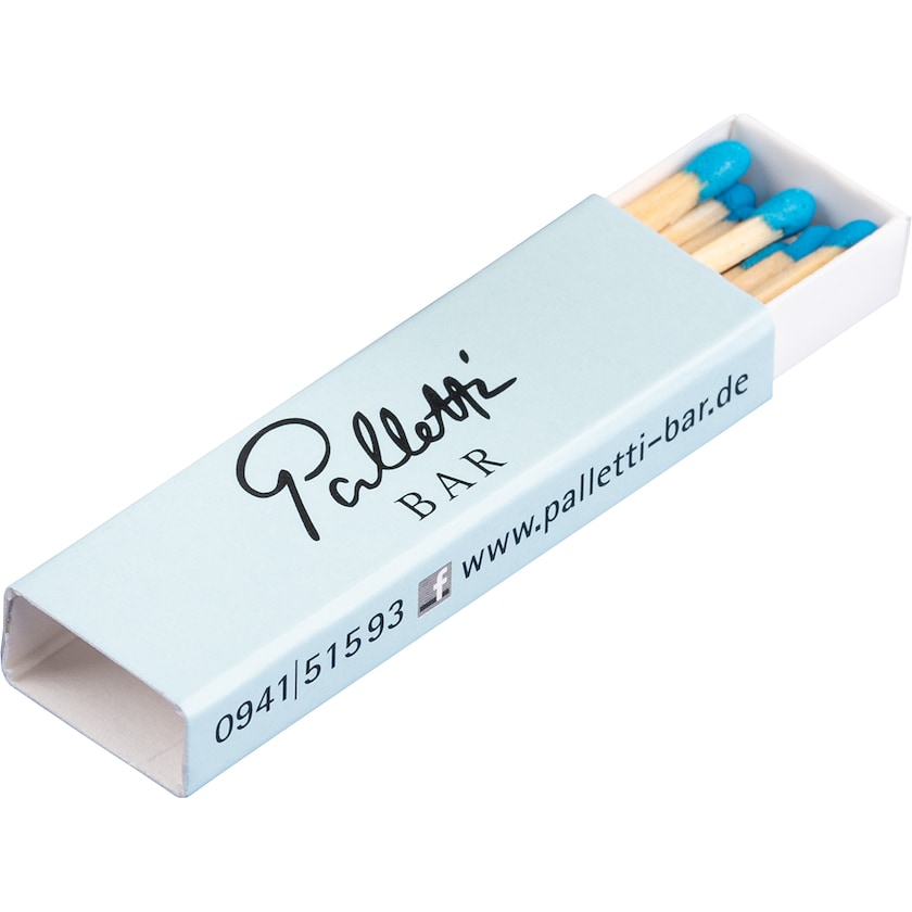 Elegante, längliche Streichholzschachtel. Kleines Format. Druck in max. 4 Farben gemäß Pantoneskala und darüberhinaus in CMYK.