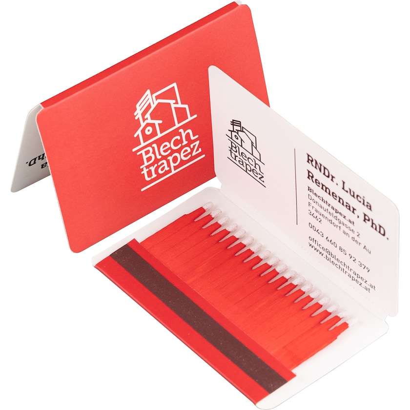 Streichholzschachtel in der gleichen Form und Größe wie eine Kreditkarte. Die Form bietet Ihnen ausreichend Platz für Ihren Aufdruck. Enthält 18 Streichhölzer. Sie haben die Wahl zwischen 16 verschiedenen Kopf- und 7 unterschiedlichen Holzfarben. Der Druck erfolgt in bis zu vier Farben nach der Pantone-Skala und kann zusätzlich im CMYK-Farbmodus ausgeführt werden.