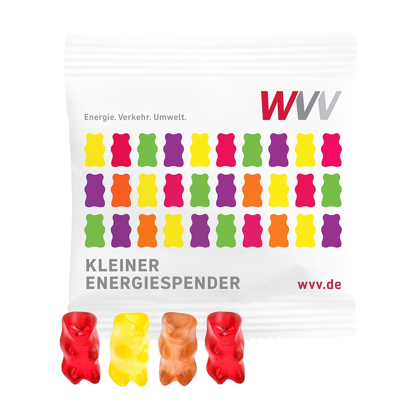 10 g Tüte mit Gummibär, die ab 1000 Stück bestellt werden kann. Gummibär mit leckerem Fruchtgeschmack. Die Tüte wird nach ihren Wünschen im 4-Farb-Fotodruck bedruckt. Die Verpackung ist aus weißem Kunststoff. Perfekt für Messen, Events oder Ausstellungen!