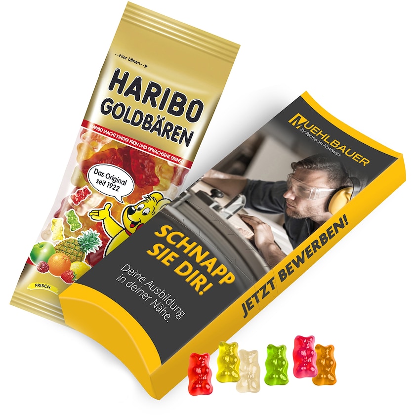 Pappverpackung mit 75 g Beutel von Haribo. Die ganze Verpackung wird nach Ihren Wünschen bedruckt.
