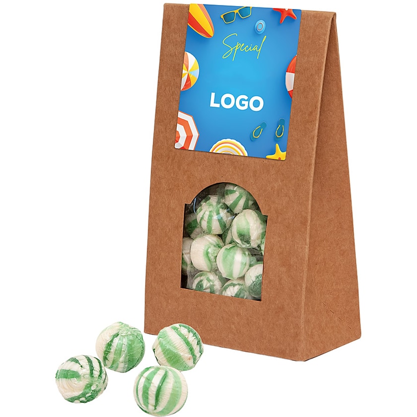 Naturfarbener Beutel mit zuckerfreien Karamellbonbons. Wählen Sie zwischen den Geschmacksrichtungen Minze und Fruchtmix. Der Druck erfolgt auf einem Etikett, das oben auf der Tasche angebracht wird.