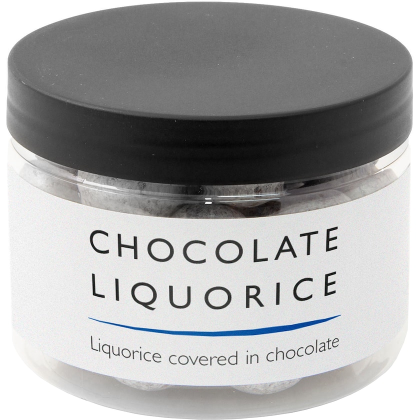 Plastikdose gefüllt mit 100 Gramm luxuriösen Lakritzkugeln. Wählen Sie zwischen Lakritzkugeln mit Schokoladenüberzug in Bronze-, Silber- oder Goldfarbe. Sie gestalten das Etikett selbst. Ein luxuriöses Geschenk für Ihre besten Kunden.