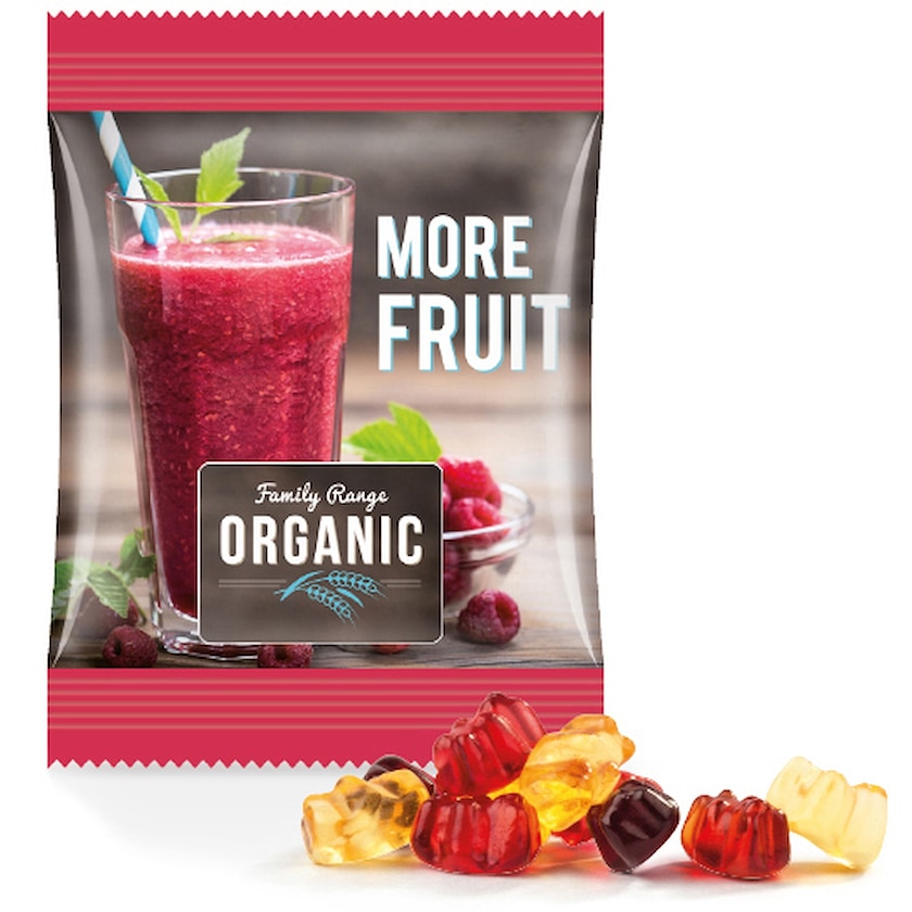 Luxuriöse Gummibären mit ganzen 30% echten Früchten. Gummibärchen vom deutsche Qualitätsherstellen Trolli und in sechs gemischten Geschmacksrichtungen. Die ganze Verpackung wird nach Ihren Wünschen bedruckt.