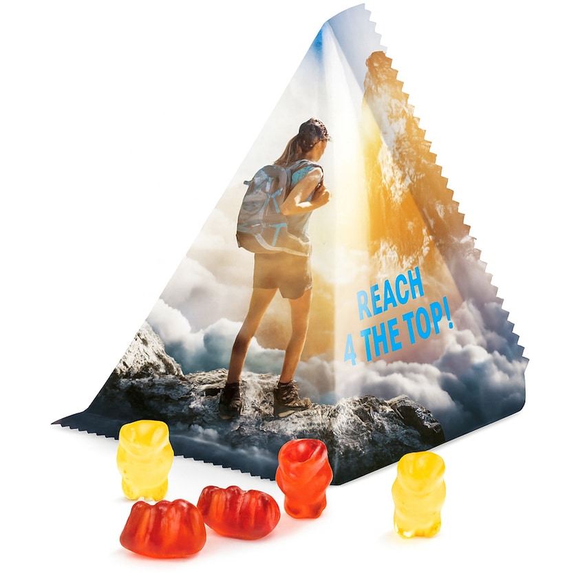 Pyramide mit luxuriöse Gummibären mit ganzen 30% echten Früchten. Weingummi vom deutsche Qualitätsherstellen Trolli und in sechs gemischten Geschmacksrichtungen. Die ganze Verpackung wird nach Ihren Wünschen bedruckt.