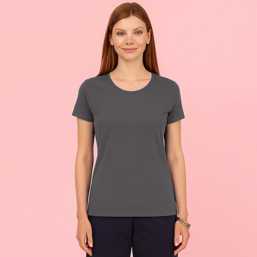 Preiswertes Damen-T-Shirt aus 100% Bio-Baumwolle. Das Shirt ist herrlich weich und passt sich einer männlichen Silhouette an. Das Shirt wird einzeln verpackt in Plastikhüllen geliefert. Alle Farben sind aus 100% Bio-Baumwolle, außer die Farbe sport grey, die aus 90% Bio-Baumwolle und 10% Viskose besteht. Gibt es auch als Herrenmodell.