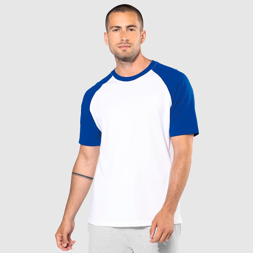 Sportliches T-Shirt mit kontrastfarbigen Ärmeln und Halsausschnitt. Aus 100% Baumwolle. Lieferung erfolgt einzeln verpackt.