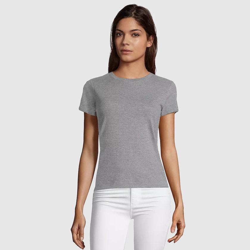 Figurbetontes Damen T-Shirt der beliebten Marke SOL´s. Der Stoff hat ein Gewicht von 150g/m² und besteht aus 100% ECO-TEX-zertifizierter Baumwolle. Das Modell fällt kleiner aus. Gibt es auch als Herrenmodell.