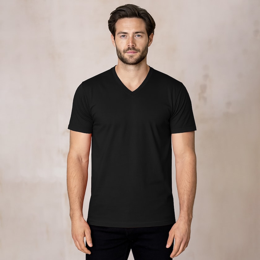 T-Shirt mit V-Ausschnitt, das bereits ab 10 Stück bestellt werden kann. Das T-Shirt besteht aus 100% Baumwolle und hat schöne Details wie Rippstrickbündchen am Ausschnitt und ein gedrucktes Etikett für höheren Komfort. Gibt es auch als Damenmodell.