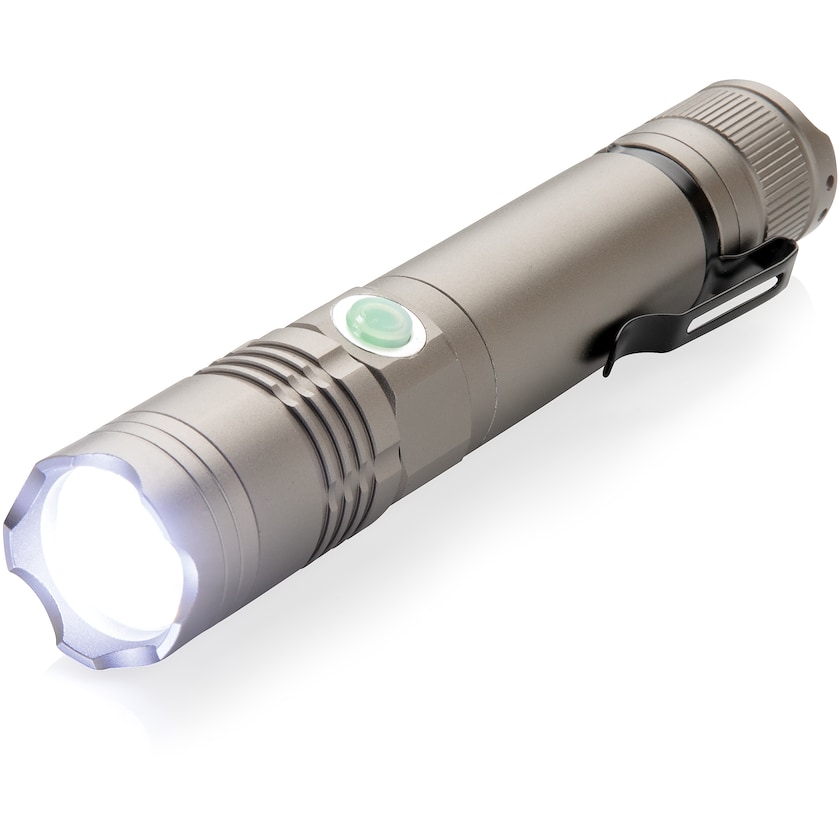 Wiederaufladbare 3W Taschenlampe. Grayson kann bis zu 200 Meter ausleuchten und verfügt über drei Lichtmodi: Fernlicht, Abblendlicht und Blinklicht. Der Akku hält mit einer Ladung bis zu 8 Stunden Nutzung stand. Das Aufladen dauert etwa 2 Stunden. Die Taschenlampe ist IPX 4-zertifiziert, was bedeutet, dass sie ebenso bei schlechtem Wetter verwendet werden kann. Micro-USB-Kabel zum Aufladen im Lieferumfang enthalten.