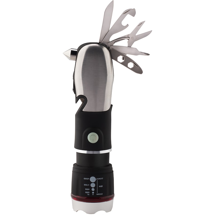 Taschenlampe mit integrierten Multi-Tools. Holbrook hat drei Lichteinstellungen mit Zoomfunktion. Angetrieben durch 3 AAA-Batterien (nicht enthalten).
