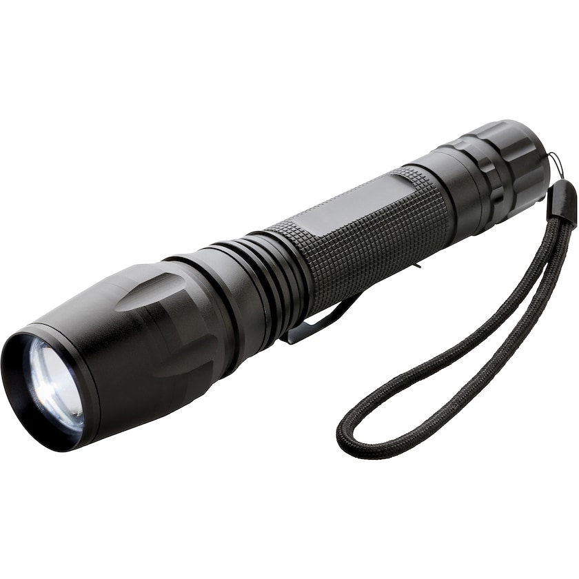 Große und stabile Taschenlampe mit leisungsstarker LED-Lampe. Die LED-Lampe ist eine Cree-Lampe und sehr leisungsstark. Die Taschenlampeist wasserbeständig und hält Stürzen aus 1 m Höhe stand. Der Lichtschein kann reguliert werden, so dass ein kleinerer oder größerer Bereich erhellt wird. Batterien im Lieferumfang.