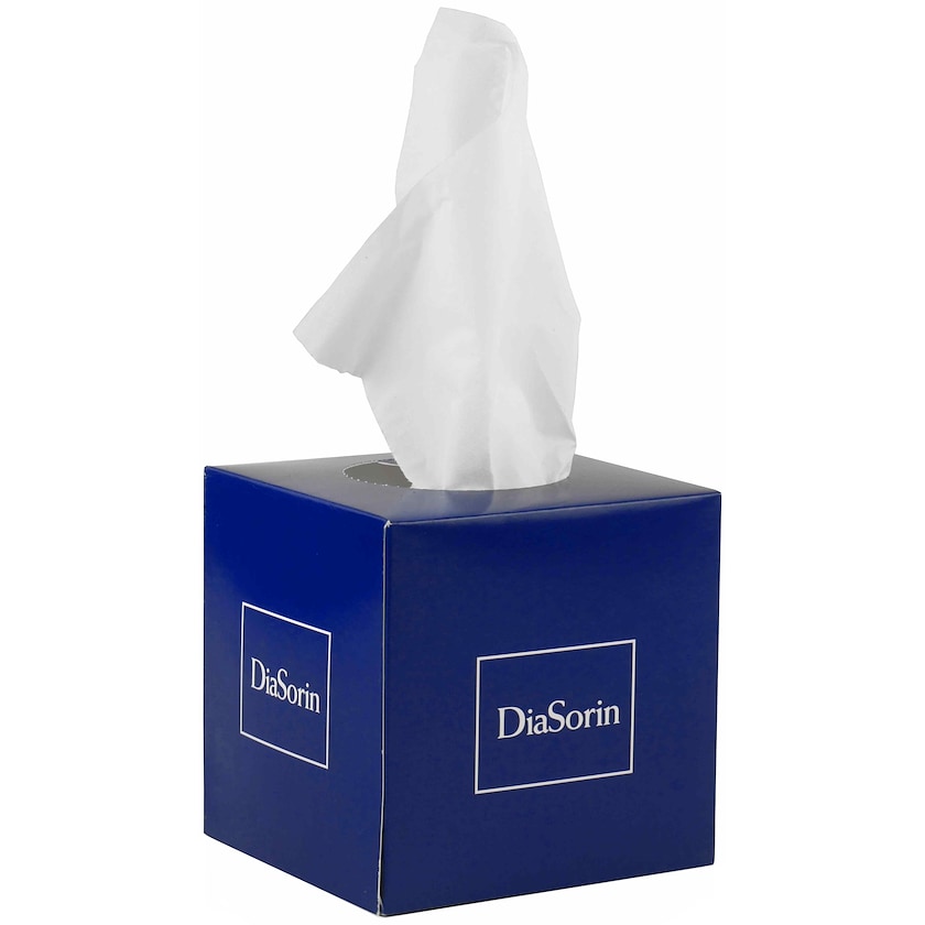 Würfelförmige Pappschachtel mit 100 Tüchern. Die Taschentücher bestehen aus Zellulose und sind zweilagig. Die gesamte Pappschachtel wird nach Ihren Wünschen bedruckt.