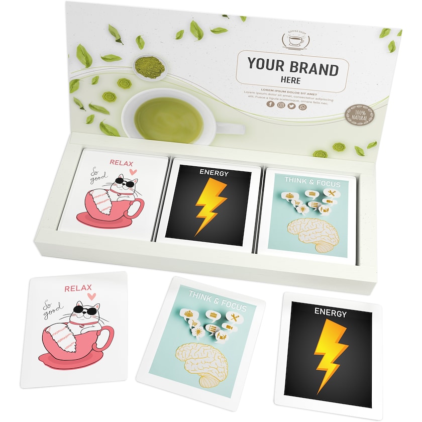 Set mit 15 Teebeuteln im Karton. Alles kommt mit Ihrem Druck! Wählen Sie zwischen mehreren verschiedenen Teesorten. Du kannst zwischen bis zu drei verschiedenen Teesorten wählen, also von jeder Sorte mindestens 5 Teebeutel.