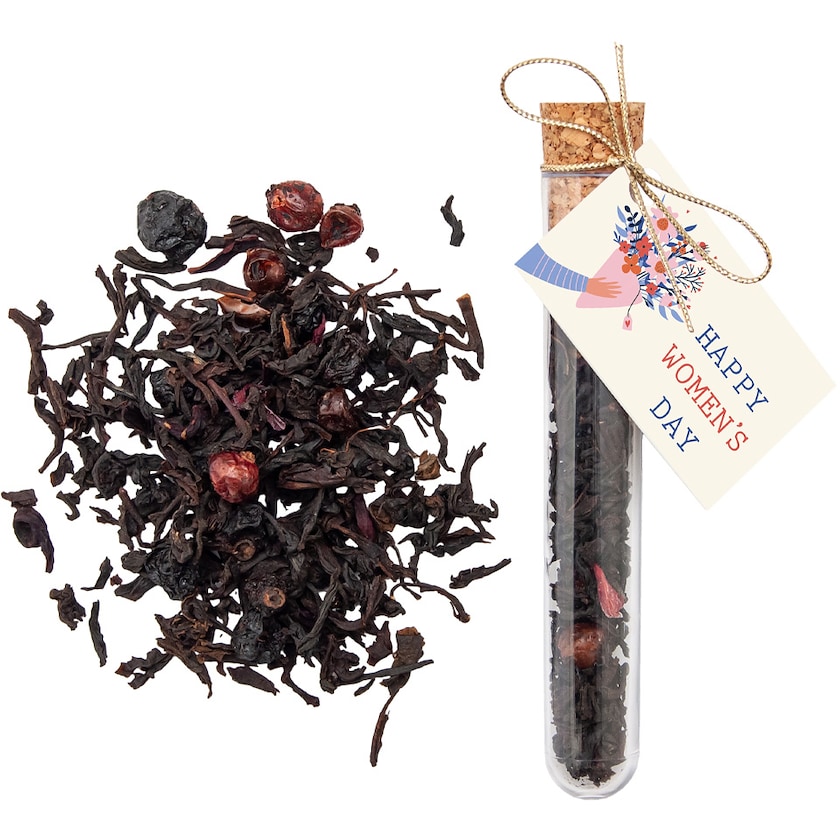 Reagenzglas gefüllt mit schwarzem Tee. Der Tee enthält Elemente der schwarzen Johannisbeere. Das Reagenzglas besteht aus Kunststoff und der Deckel aus echtem Kork. Der Aufdruck erfolgt auf der Karte, die mit einem silbernen oder goldenen Band am Reagenzglas befestigt wird.