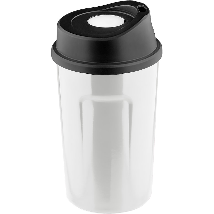 Vakuumisolierter Thermobecher aus Edelstahl. Der Becher ist auslaufsicher und der Deckel kann mit einer Hand geöffnet werden. Wählen Sie zwischen Druck und Lasergravur.