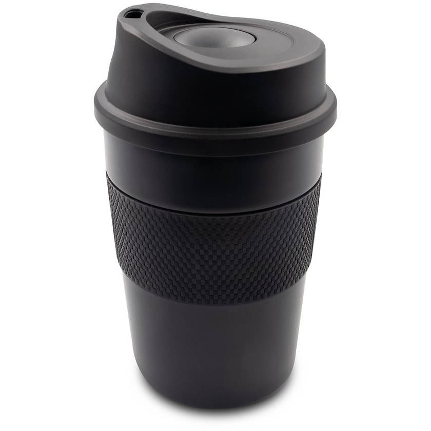 Thermosbecher aus Edelstahl. Der Becher hat innen und außen aus Edelstah vakuumisolierte Wände und einen Kunststoffdeckel mit flexiblem Trinkgriff, der geöffnet und geschlossen werden kann. Rund um den Becher befindet sich ein bequemer Gummigriff.