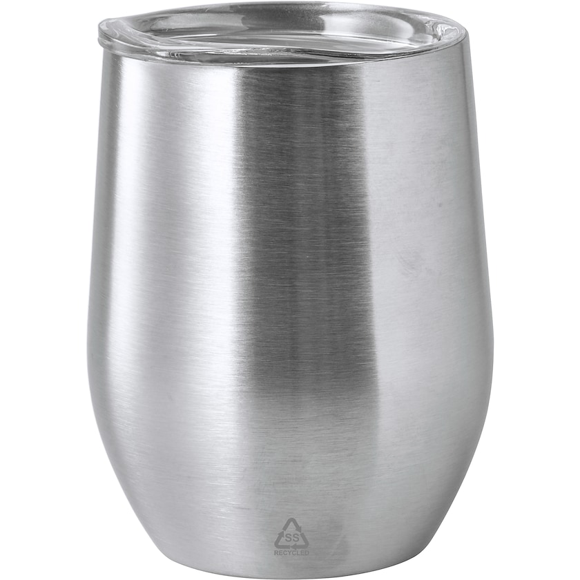 Sanft gestalteter Thermobecher aus recyceltem Edelstahl. Dank der doppelten Wände bleibt das Getränk lange Zeit heiß. Der Deckel ist aus Kunststoff gefertigt. Ein Symbol auf der Vorderseite zeigt, dass der Becher aus recyceltem Edelstahl hergestellt ist.