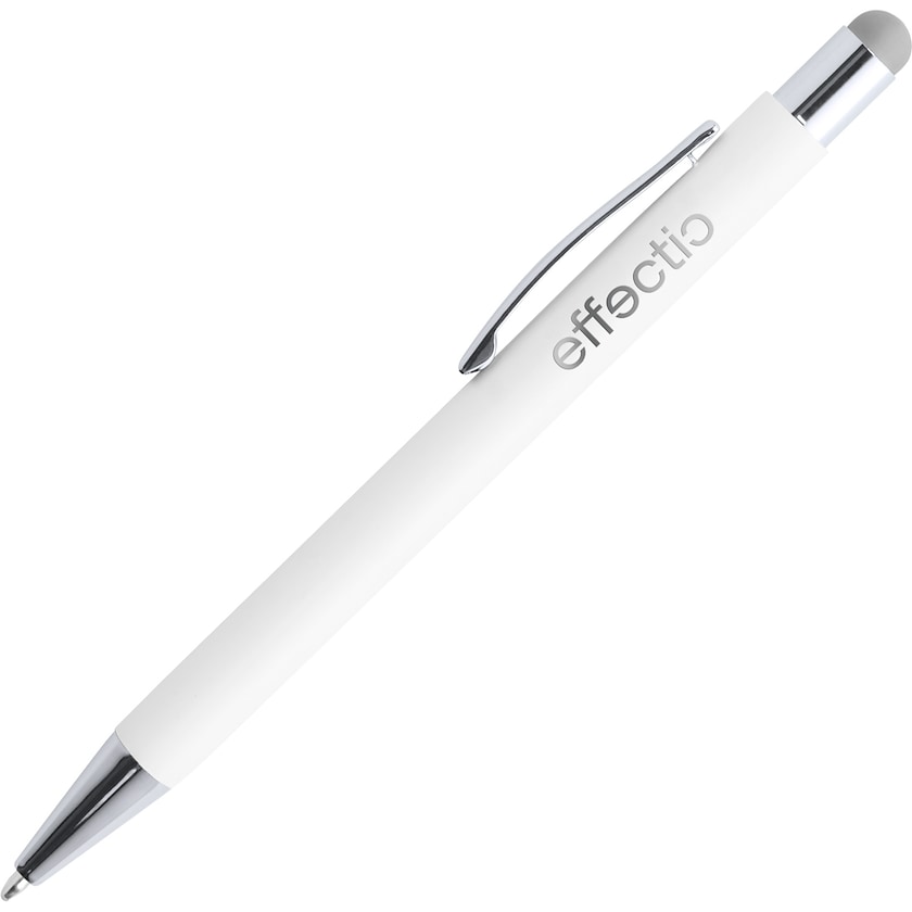 Weißer Touchpen mit farbig erscheinender Lasergravur. Wenn der Stift gelasert wird, erscheint das Motiv in der gleichen Farbe wie der Touchpen. Der Kugelschreiber besteht aus Aluminium und hat eine blaue Tintenpatrone.