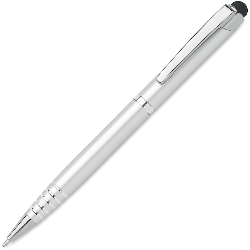 Aufwendiger Touchpen aus recyceltem Aluminium. Der Stift hat einen Drehmechanismus und blaue Tinte. Wählen Sie zwischen Druck und Lasergravur.