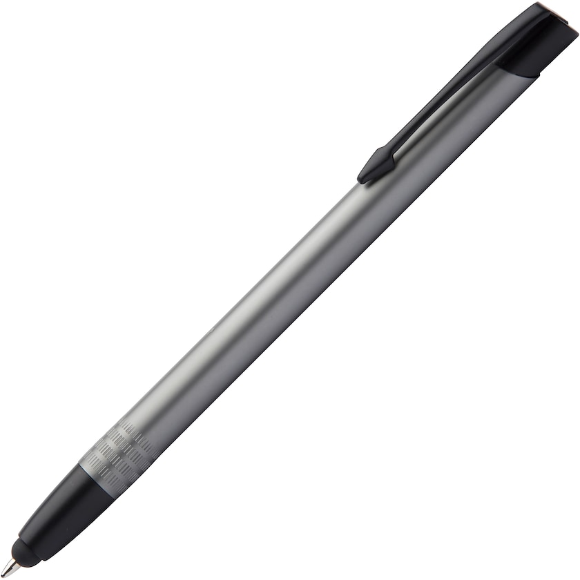 Touchpen mit Stiftkörper aus mattem Aluminium. Der Stift hat blaue Tinte. Das Logo wird aufgedruckt oder gelasert. Bei 1-farbigem Druck beträgt die Druckfläche ganze 90 x 5 mm.