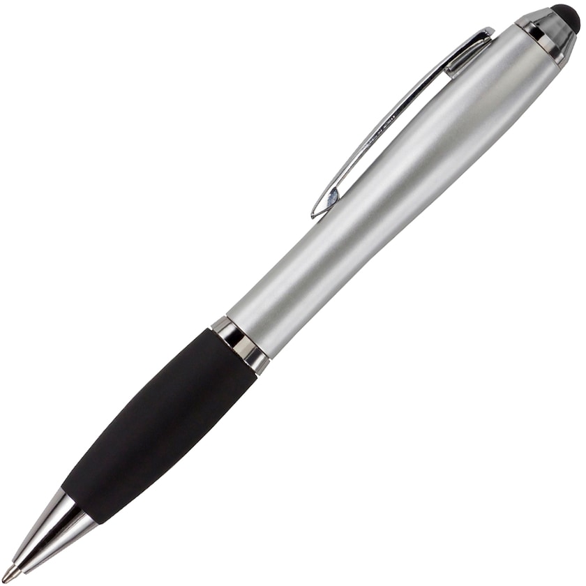 Preiswerter Touchpen und Kugelschreiber in einem. Mit bequemem Gummigriff. Der Kugelschreiber hat schwarze Tinte.