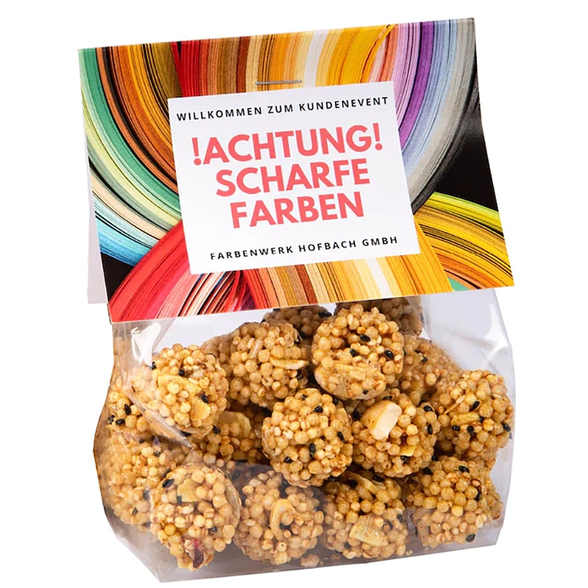 Große Tüte Müslibällchen. Die Karte oben kann bedruckt werden. Die Müslibällchen bestehen aus Quinoa, Kokosnuss, Sesam und Sonnenblumenkernen und werden mit Curry und einer Prise Chili gewürzt. Eine gesunde Alternative zu Chips, Süßigkeiten und Schokolade.