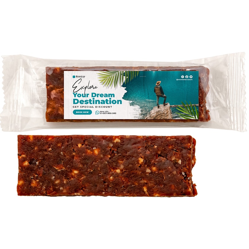 Fruchtiger Riegel aus Datteln, Nüssen und Chiasamen. Ceri hat einen 100 % natürlichen Inhalt ohne Zuckerzusatz. Der Druck erfolgt auf einem Etikett, welches auf der Oberseite angebracht wird.