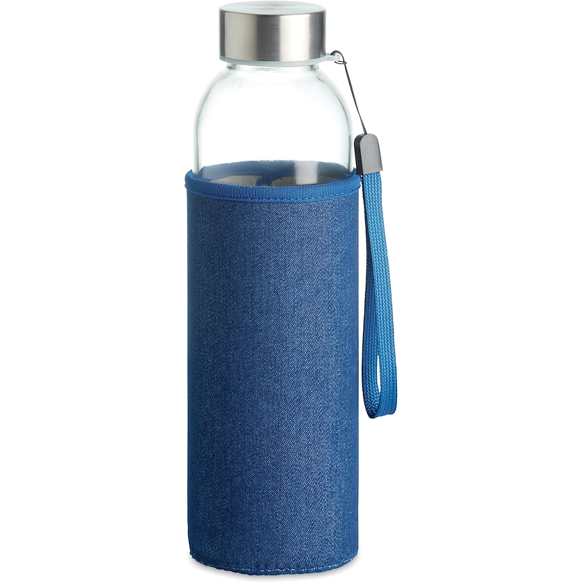Glasflasche mit Neoprenhülle in Denim-Optik. Die Glasflasche fasst 50 cl. Der Deckel ist aus Edelstahl. Bei 1-farbigem Druck beträgt die Druckfläche ganze 150 x 90 mm. Die Glasflasche ist nicht für kohlensäurehaltige Getränke geeignet.