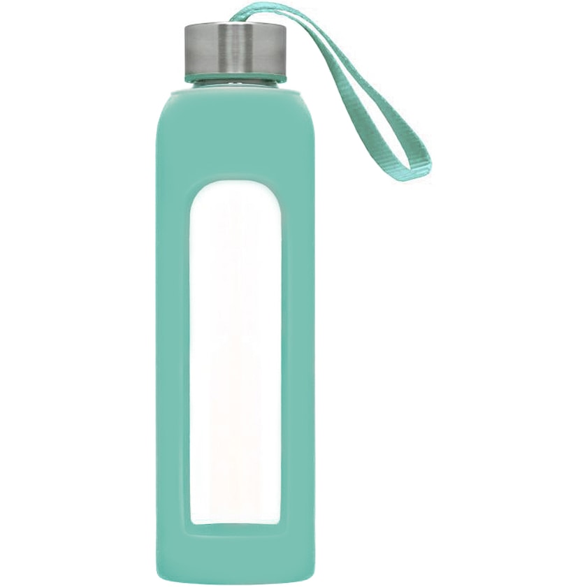 Trinkflasche aus Borosilikatglas mit Silikonüberzug. Die Flasche ist selbstverständlich lebensmittelecht. Eine elegante und praktische Trinkflasche für jede Gelegenheit.