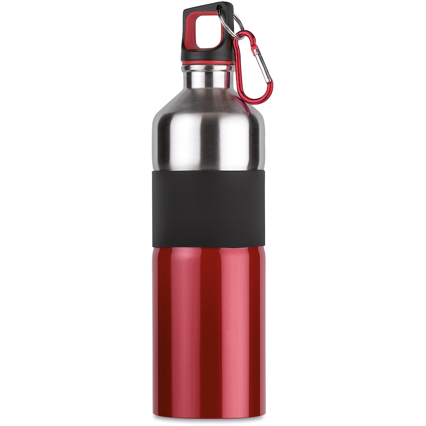 Trinkflasche aus rostfreiem Stahl mit Gummigriff und Karabinerhaken.