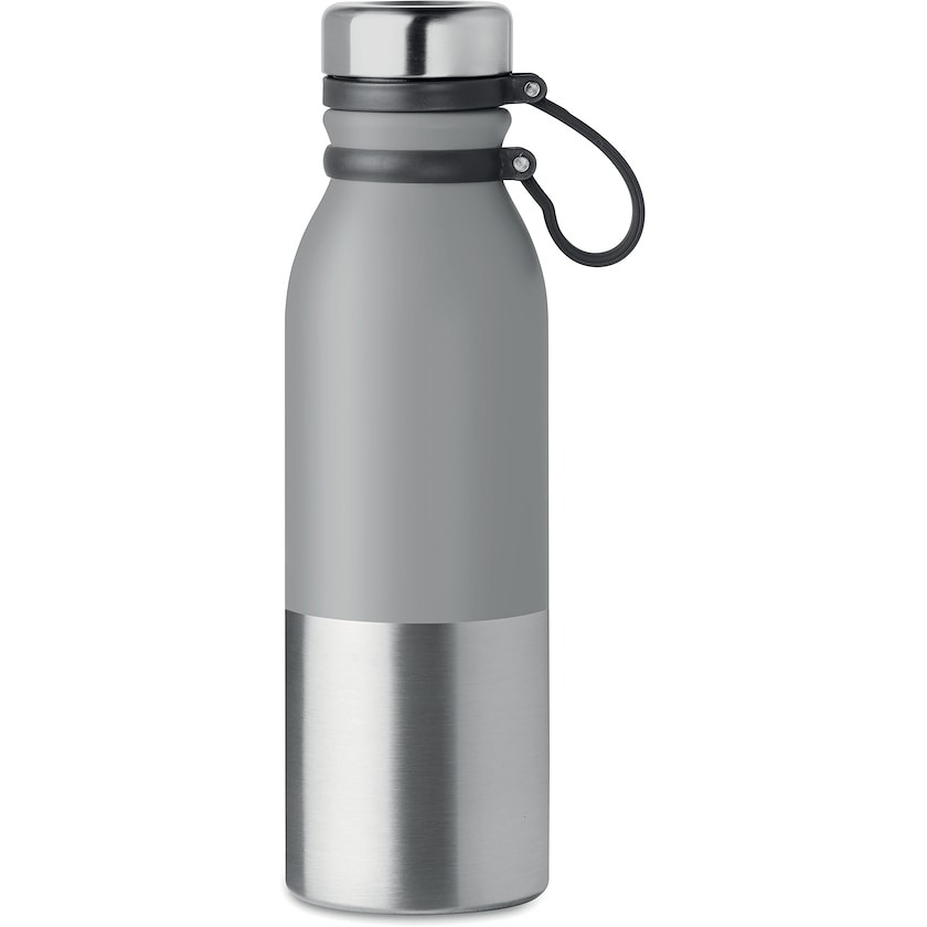 Wasserflasche aus Edelstahl mit ummanteltem oberen Teil. Gerald hat einen Silikonmantel, wodurch die Flasche angenehmer in der Hand liegt. Die Flasche ist absolut auslaufsicher. Bei einfarbigem Druck beträgt die Druckfläche ganze 190 x 65 mm.