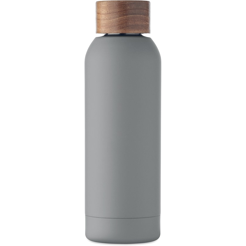 Stilvolle Wasserflasche aus recyceltem Edelstahl mit Holzverschluss. Die Flasche besteht zu 90 % aus recyceltem Edelstahl und zu 10 % aus normalem Edelstahl. Die Oberfläche hat eine Gummibeschichtung. Der Verschluss ist aus Akazienholz gefertigt. Die Wasserflasche hat einfache Wände, wodurch bei heißen Getränken Wärmeübertragung stattfinden kann.