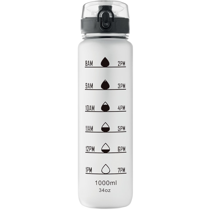 Wasserflasche aus rPET mit Zeitmarkierungen. Der Verschluss ist mit einer Sicherheitsverriegelung versehen und kann mit einer Hand geöffnet werden. Auslaufsicher.
