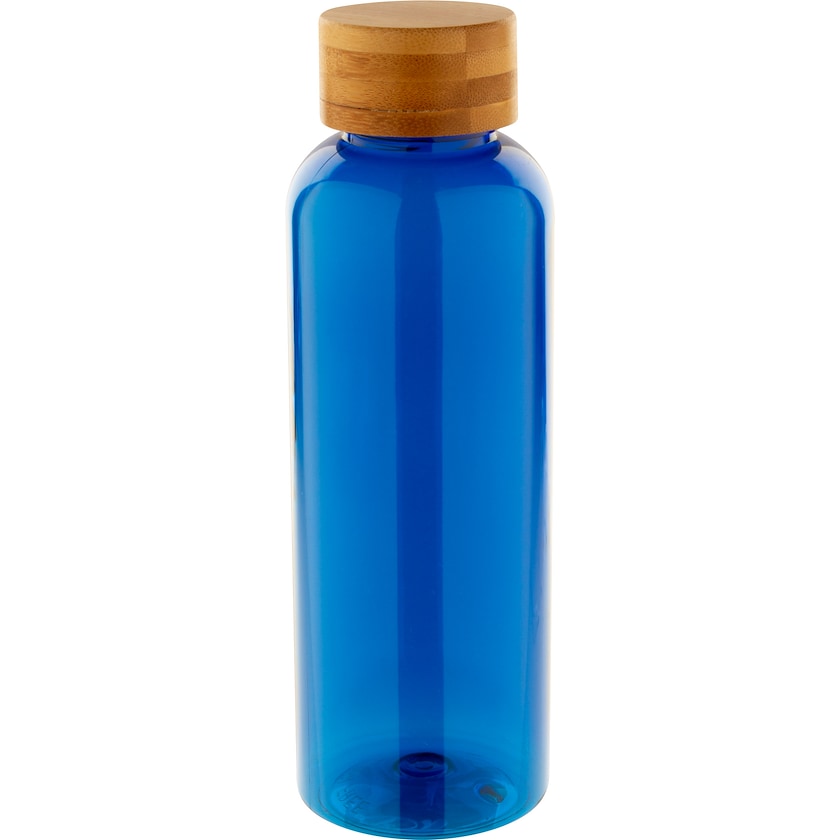 Wasserflasche aus recyceltem Material mit Bambusdeckel. Die Flasche besteht aus rPET, also recycelten PET-Flaschen. Nicht geeignet für kohlensäurehaltige Getränke.