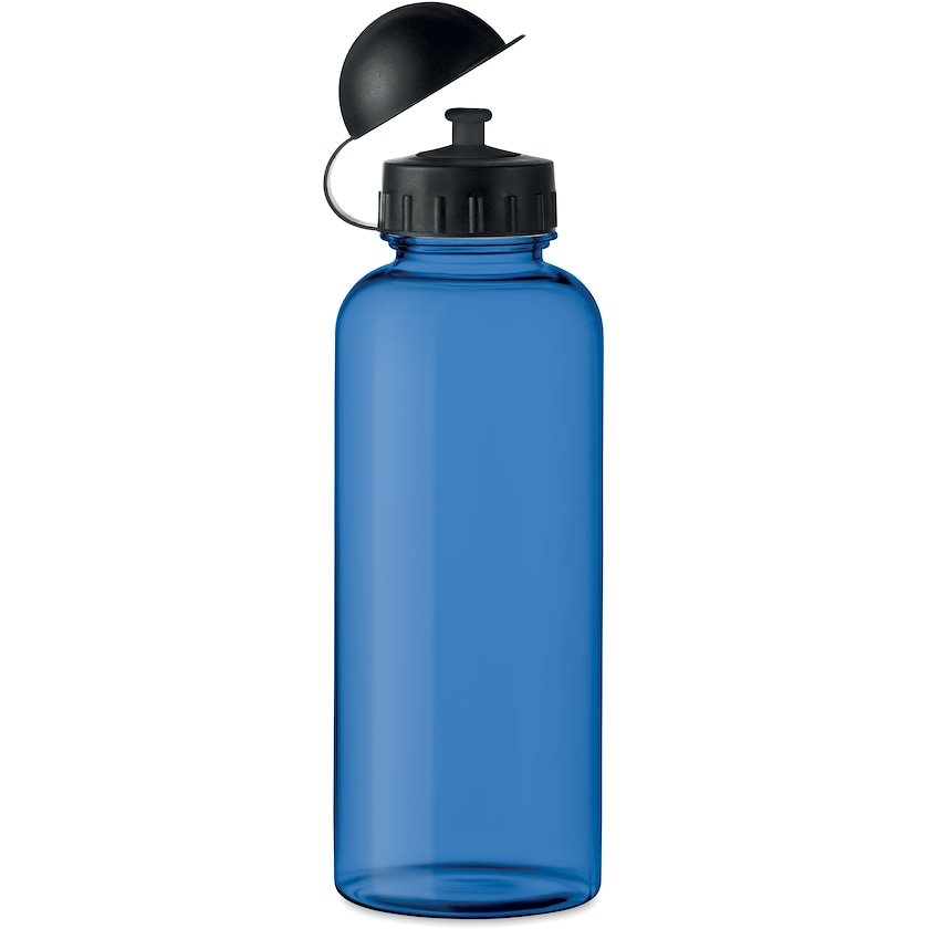 Umweltfreundliche Wasserflasche von rPET. Der Flaschenkörper besteht aus recycelten PET-Flaschen, also rPET, und der Deckel aus PP-Kunststoff. Die Flasche ist für kohlensäurehaltige Getränke ungeeignet.