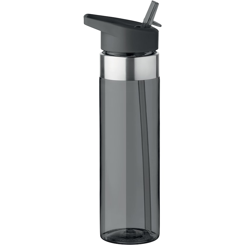 Modern designte Trinkflasche mit Mundstück. Oben befindet sich ein eleganter Ring aus rostfreiem Edelstahl. Die Flasche ist transparent und in mehreren Farben erhältlich. Der Druck ist nur in einer Farbe möglich.