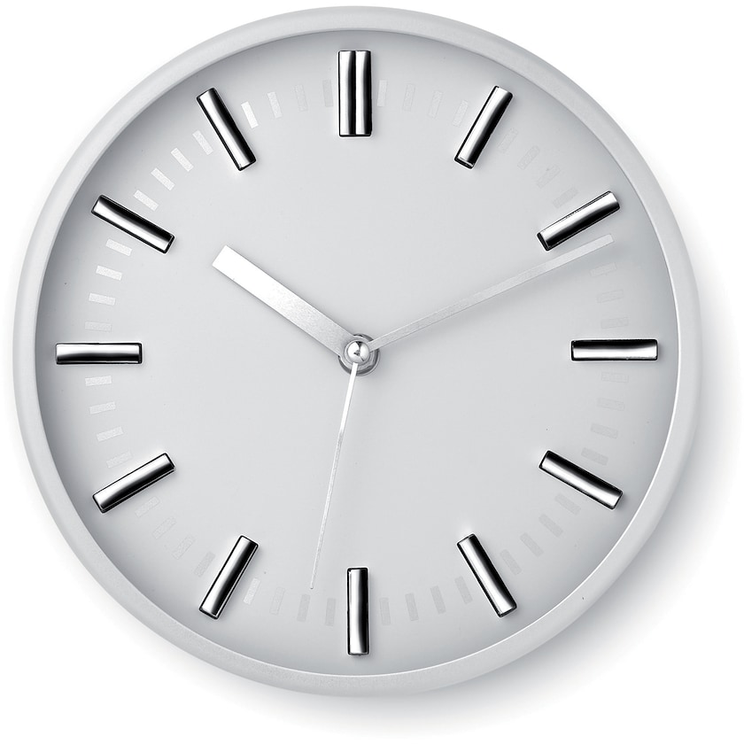 Runde, silberfarbene Wanduhr in modernem Design. Wird mit einer AA-Batterie betrieben (nicht enthalten).