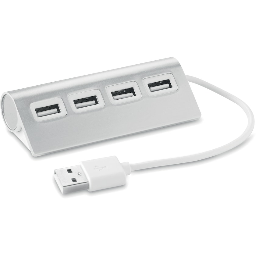 Eleganter USB-Hub aus Aluminium. Baileyhat 4 USB 2.0-Anschlüsse. Kabellänge 14,5 cm. Das Logo wird mit Druck oder Lasergravur aufgebracht.