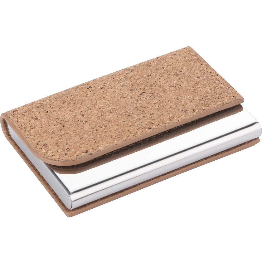 Visitenkartenetui aus Metall und Kork. Das Visitenkartenetui fasst bis zu 20 Visitenkarten. Der Deckel wird mit einem Magneten geschlossen. Die Beschriftung erfolgt mit Lasergravur.