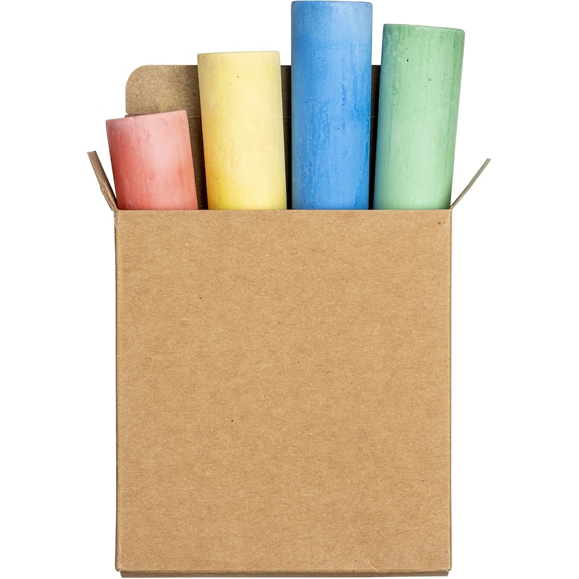 Vier Straßenkreiden in einer naturfarbenen Pappschachtel. Ein ansprechendes Werbegeschenk für kreative Kinder.