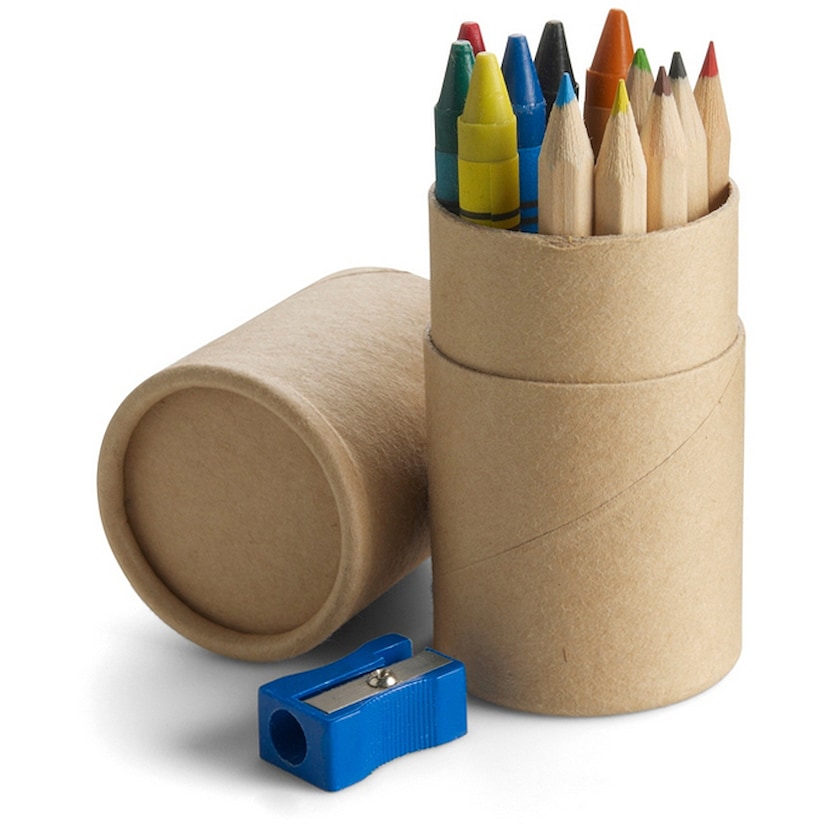 Pappröhre mit 6 Wachsmalstiften, 6 Buntstiften und 1 Anspitzer. Ein schönes und günstiges Geschenk für alle Kinder.