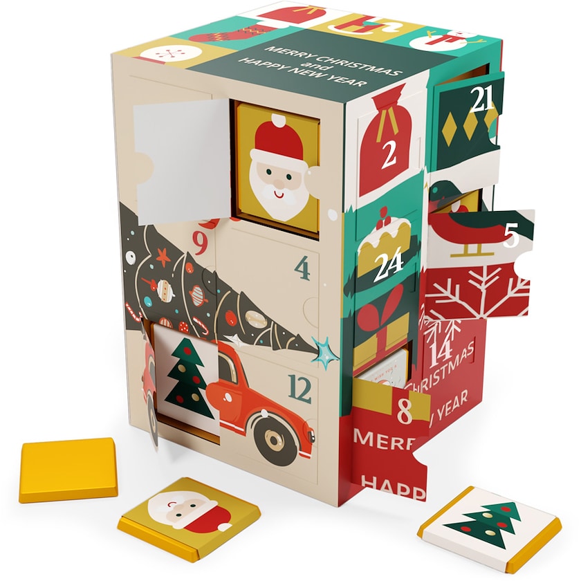 Kubischer Adventskalender gefüllt mit luxuriöser belgischer Schokolade. Dieser Adventskalender enthält 24 Schokoladenstücke, die auf vier Seiten verteilt sind. Sowohl der Adventskalender als auch das Papier auf jedem einzelnen Schokoladenstück werden nach Ihren Wünschen bedruckt. Wählen Sie zwischen Milchschokolade 32 % und dunkler Schokolade 62 %. Die Folienfarbe kann gold- oder silberfarben sein.